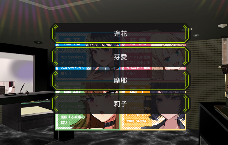 喜欢被双性女孩欺负的你,在下班后来到了一家专门提供反向刚胶服务的风俗店。从4位女孩中选择你喜欢的类型吧!